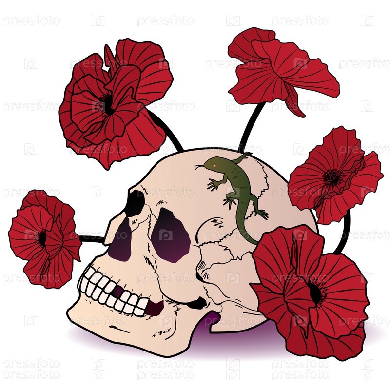 Череп с ящерицей и маками