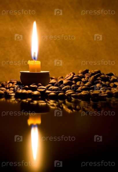 Зерна кофе, освещенные пламенем свечи, на темном фоне с отражением