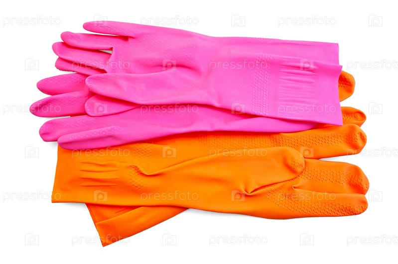 Оранжевые и розовые резиновые перчатки на белом фоне