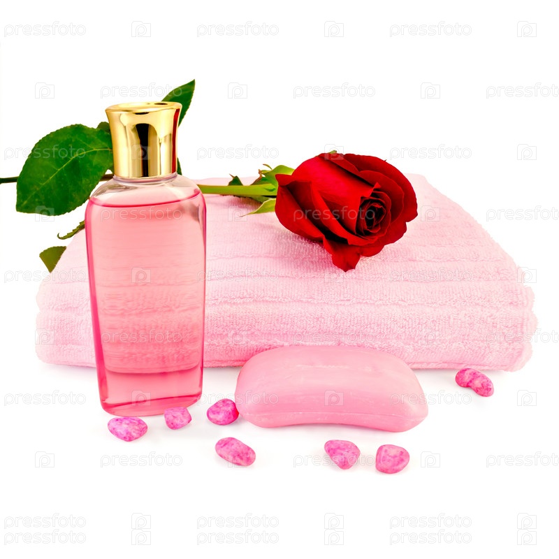 Флакон розового геля для душа, розовое мыло, полотенце, соль для ванны и красная роза на белом фоне