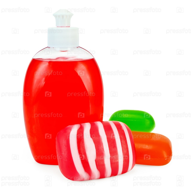 Красное жидкое мыло во флаконе, твердое красное, зеленое и полосатое мыло на белом фоне