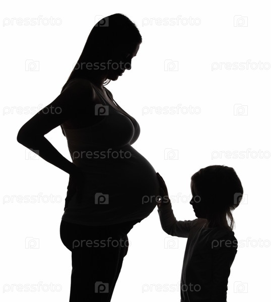 Черные силуэты беременной женщины и маленькой девочки на белом фоне