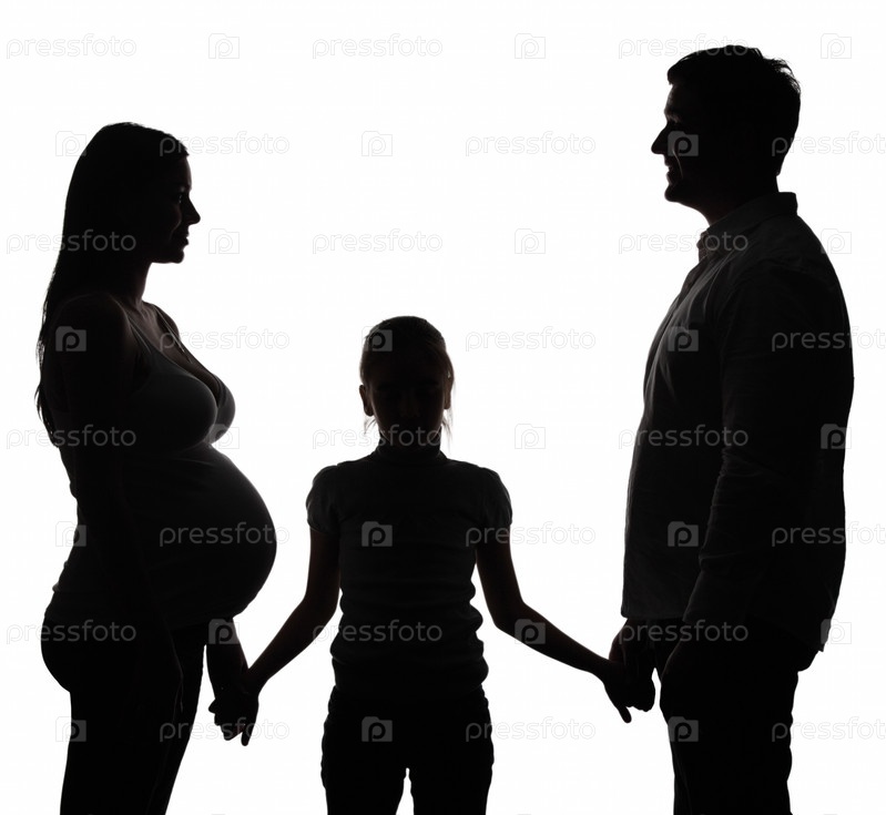 Черные силуэты беременной матери, отца и дочери на белом фоне