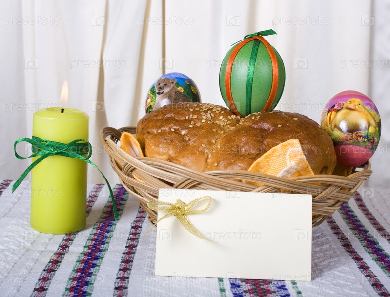 Пасхальный хлеб, яйца и открытка