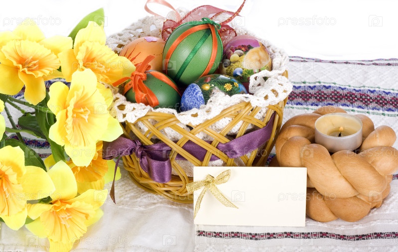 Пасхальный хлеб, яйца и открытка