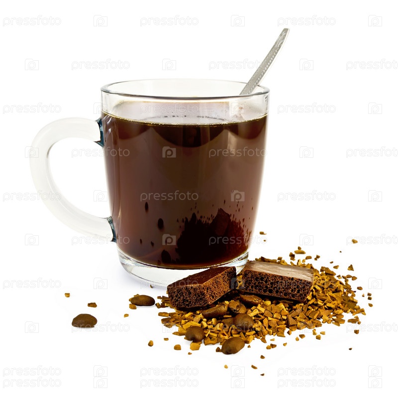 Кофе в стеклянной кружке, зерна кофе на столе и темный пористый шоколад на белом фоне