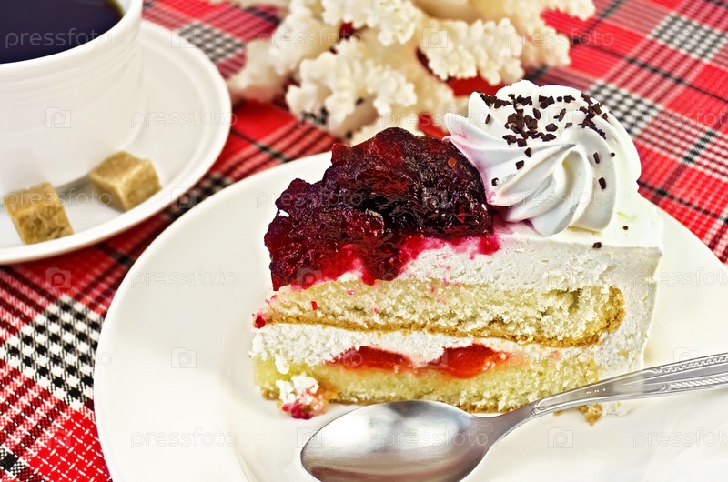 Кусок торта на тарелке и чашка кофе