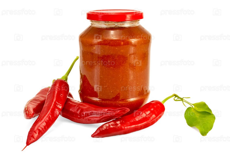 Банка томатного соуса и красные перцы чили на белом фоне
