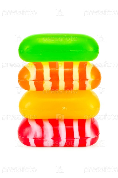 Четыре куска мыла разных цветов на белом фоне