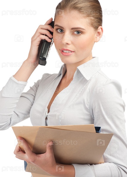 Молодая деловая женщина с документами разговаривает по телефону