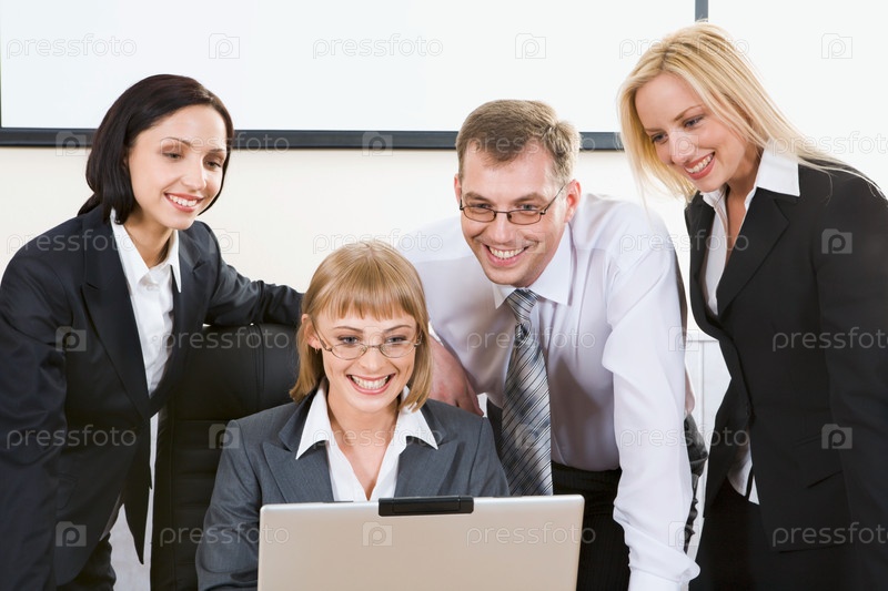 Милая бизнес-женщина сидела за столом, работая над ноутбуком и три бизнесмена собрались вместе позади нее, глядя на монитор ноутбука в ожидании результата