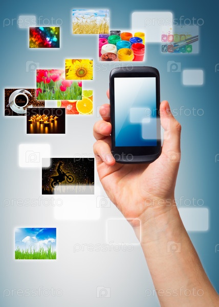 Рука с телефоном с мультимедиа