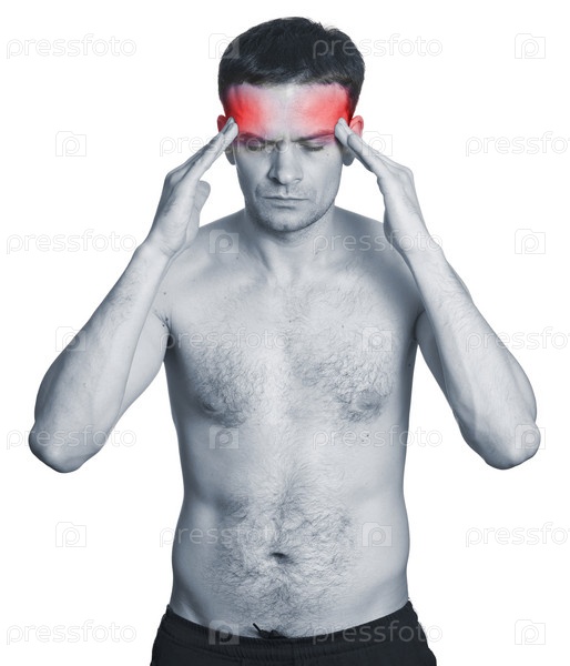 Молодой человек с головной болью на белом фоне