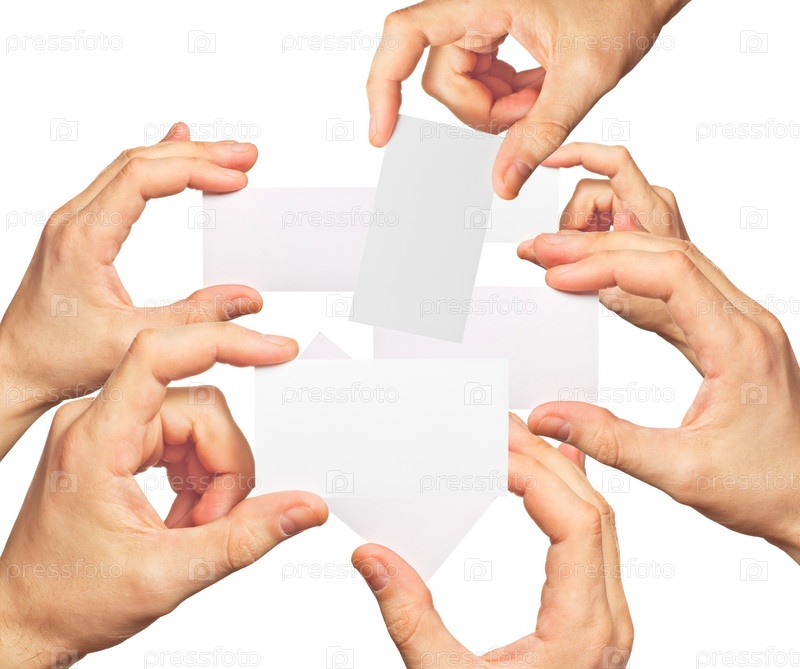 Визитные карточки в руках на белом фоне