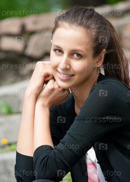 Портрет красивой молодой женщины, сидящей на свежем воздухе
