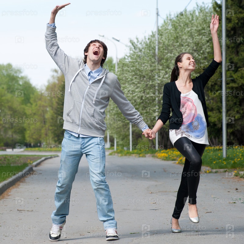 Счастливый Янг пара вместе прогулки в парке и с удовольствием
