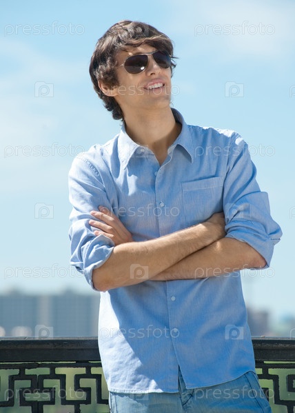Портрет красивого молодого человека в солнцезащитных очках, стоящего со скрещенными руками на улице