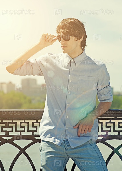 Портрет красивого молодого человека в солнцезащитных очках, стоящего на улице