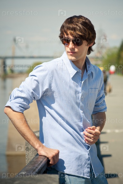 Портрет красивого молодого человека в солнцезащитных очках, стоящего на улице