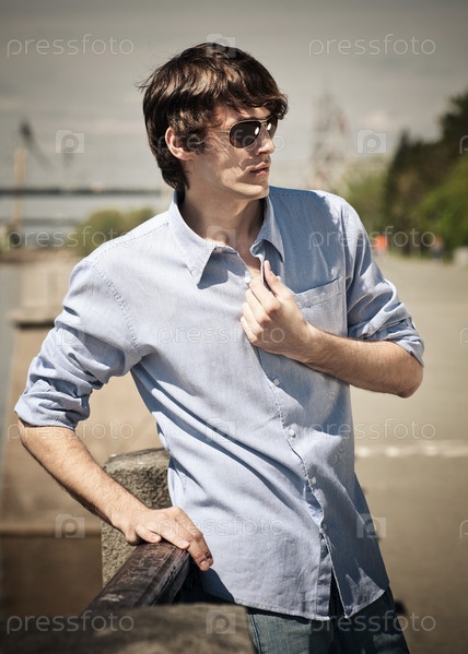 Портрет красивого молодого человека в солнцезащитных очках, стоящего на улице