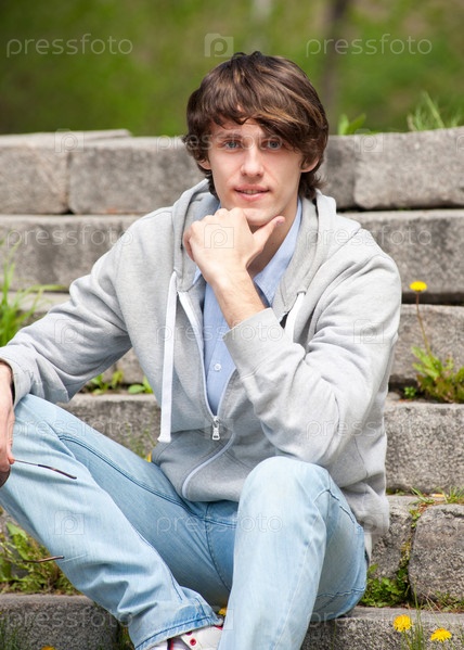 Портрет красивого молодого человека в повседневной одежде, сидящего на лестнице в парке