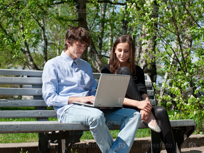 Молодая пара с ноутбуком сидит на скамейке в парке