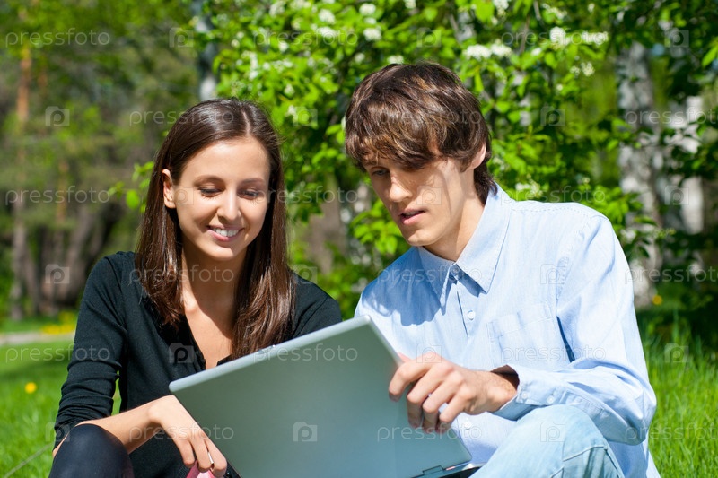 Молодая пара с ноутбуком сидит на скамейке в парке