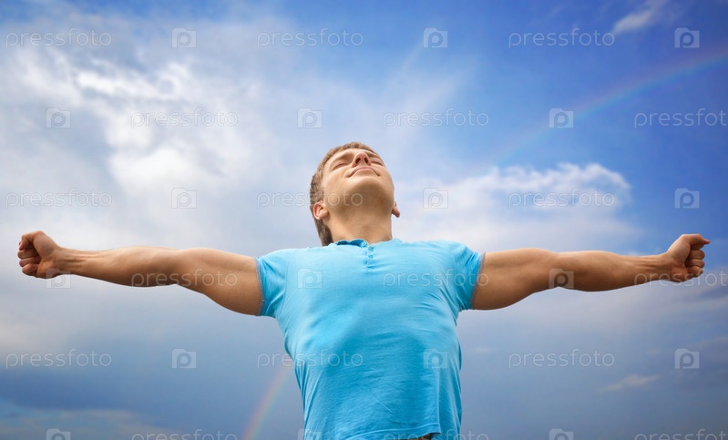 Счастливый молодой человек стоит с закрытыми глазами и распростертыми руками на фоне синего неба