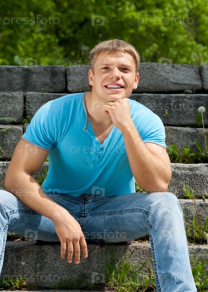 Портрет красивого молодого человека в повседневной одежде, сидящего на лестнице в парке