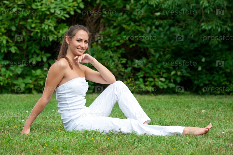 Молодая красивая женщина в белой одежде сидит на траве