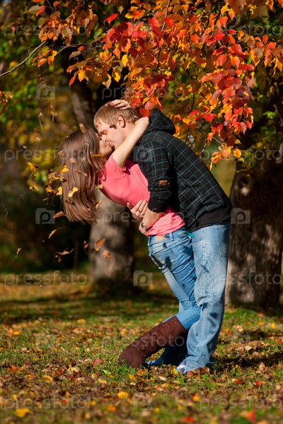 Молодая красивая пара целуется в осеннем парке