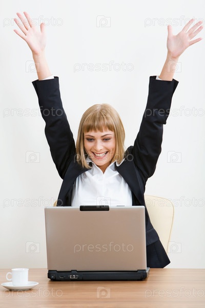 Портрет улыбающейся деловой женщины с поднятыми руками, сидящей за столом с открытым ноутбуком и чашей на нем