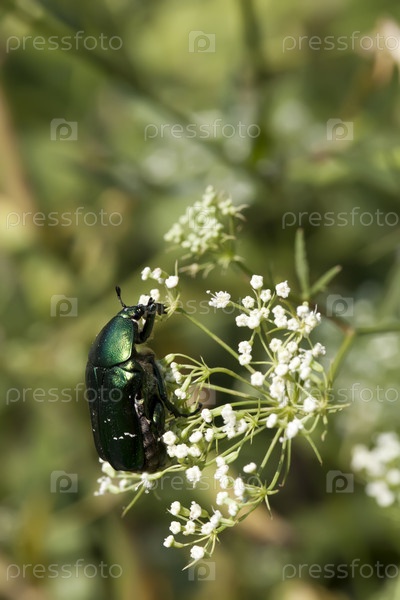 Зеленый жук сидит на белом цветке
