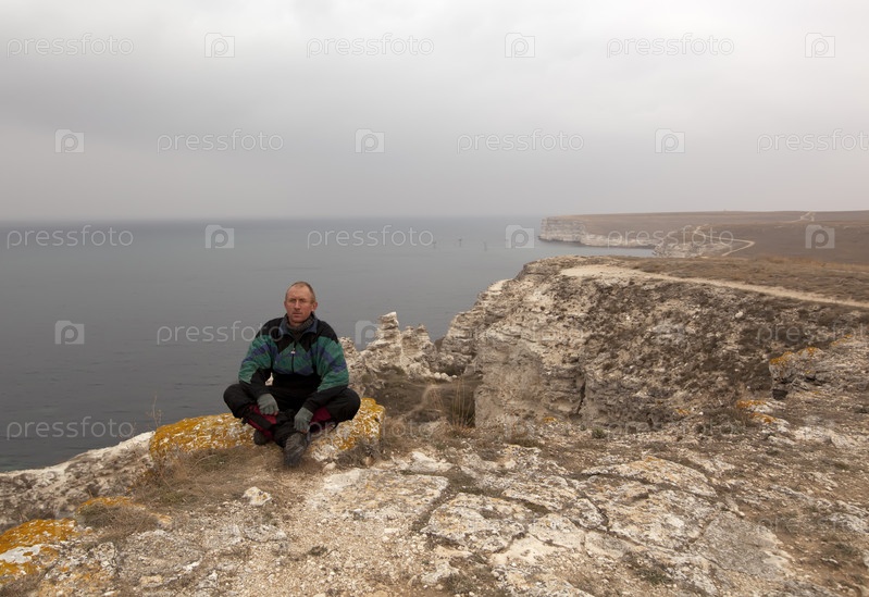 Усталый человек отдыхает, сидя на берегу моря в августе