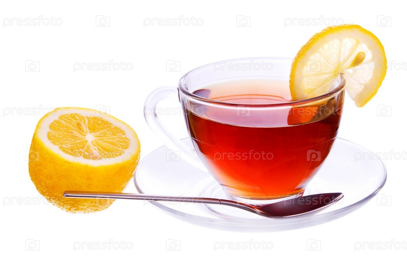 Прозрачная чашка черного чая с лимоном и ложка, изолированные на белом фоне