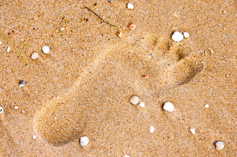 След ноги на песке смаленькими ракушками