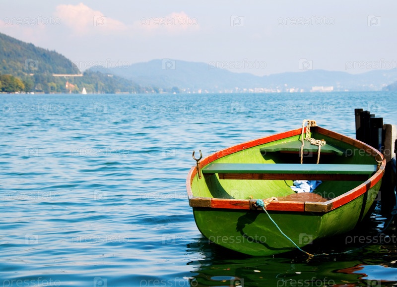 Зеленая деревянная лодка на воде с горами на фоне