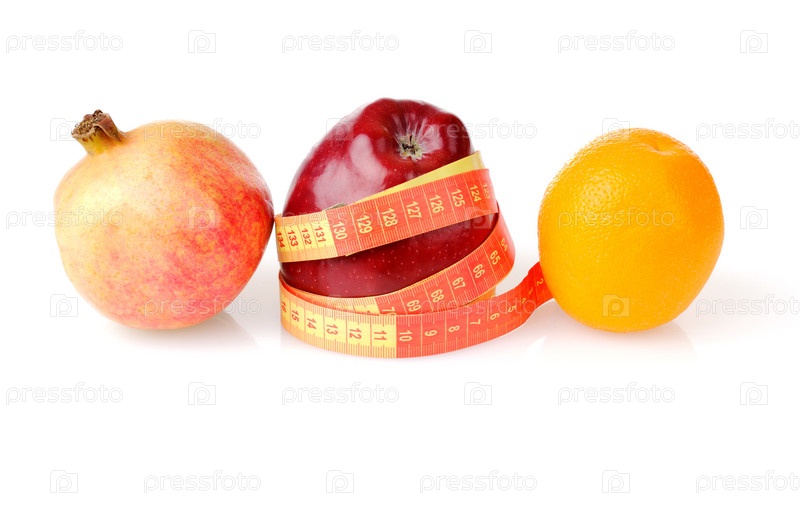 Красное свежее яблоко, гранат, апельсин и сантиметр