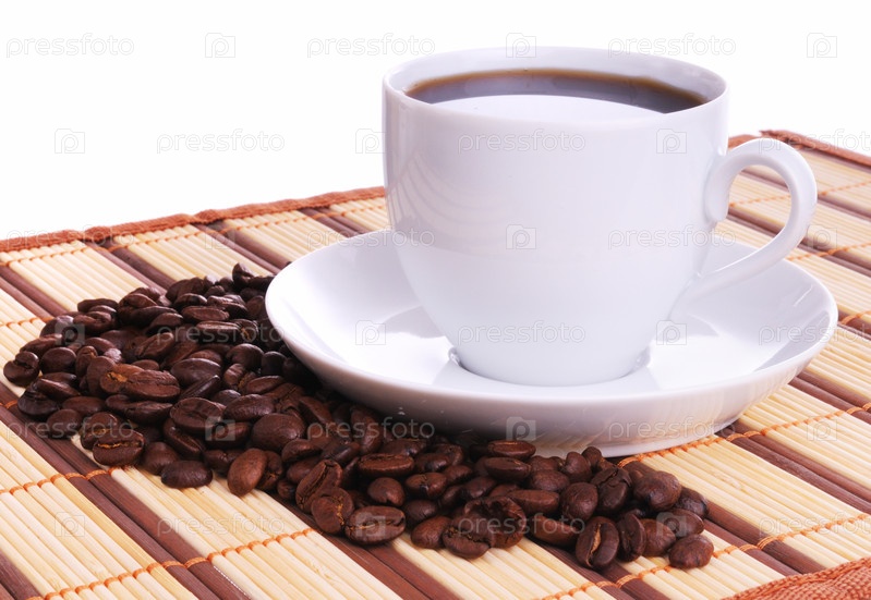 Белая чашка с кофе на бамбуковой циновке и кофейные бобы