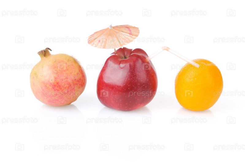 Гранат, апельсин и красное свежее яблоко с зонтиком и соломинкой