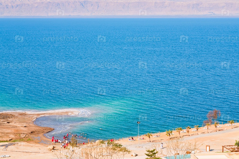 Панорама с людьми на песчаном пляже Мертвого моря, Иордания