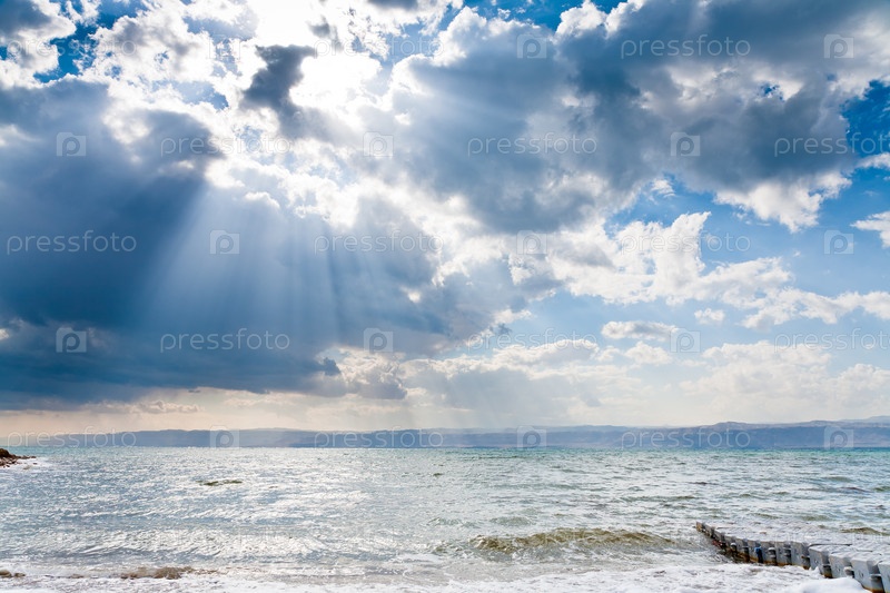 Солнечные лучи, пробивающиеся сквозь темные облака над Мертвым морем