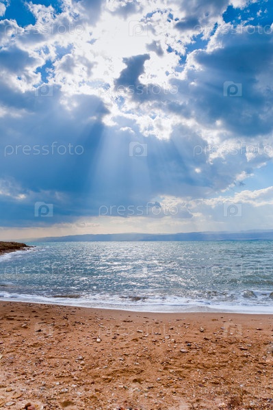 Солнечные лучи, пробивающиеся сквозь темные облака над Мертвым морем