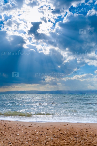Солнечные лучи, пробивающиеся сквозь темные облака над Мертвым морем