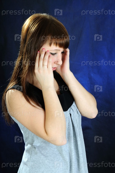 Молодая девушка потирает голову на темно-синем фоне