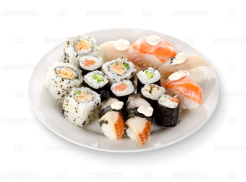 Суши и роллы на тарелке, изолированные на белом фоне