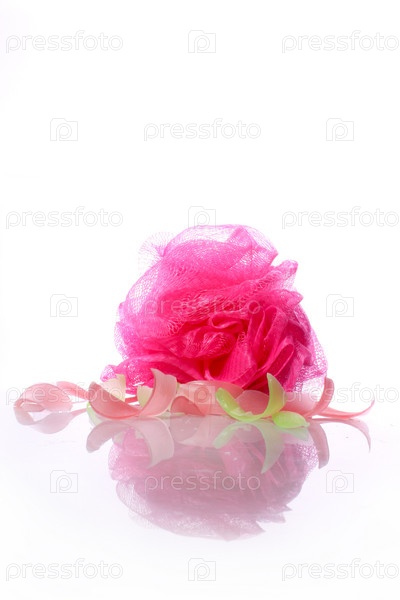 Мыло ручной работы и мочалка на белом фоне