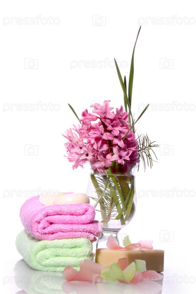 Мыло, полотенца и гиацинт на белом фоне