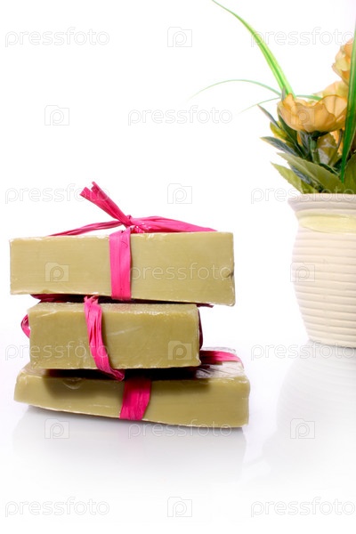 Мыло ручной работы и букет из желтых цветов в горшке