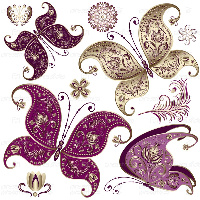 Фиолетовые и золотые старинные бабочки и цветы